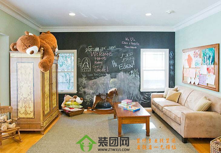 最适合做黑板墙设计的还是儿童房里面,给孩子准备一整面的黑板墙,给他/她涂涂画画,再也不担心家里其他墙面会被涂改了。