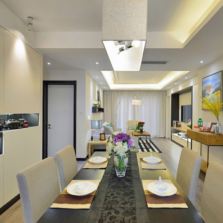 客厅没有与餐厅分隔,将餐桌置于进出厨房入户玄关的两条通道之间,保证动线流畅的同时保留足够的就餐空间。