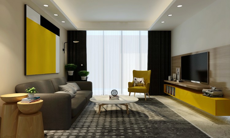浅灰色系为基调,明黄色做点缀,无论是柠檬黄的老虎凳,还是木制的画框,都赋予空间一股临动感。